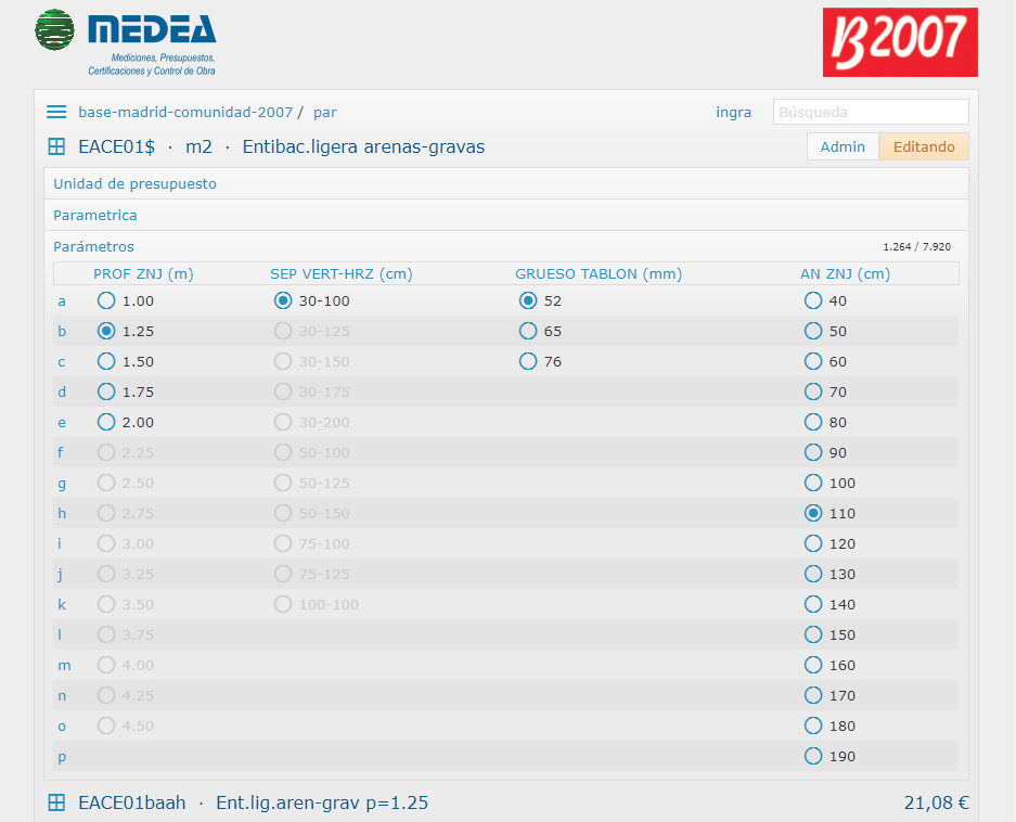 Una vez elegida una combinación, podemos trasladar a un presupuesto ese precio, que en este caso tiene seleccionadas las opciones b-a-a-h, con una descomposición en 2 materiales, 2 especialidades de mano de obra y unos medios auxiliares que son un porcentaje (3%) de los otros componentes: